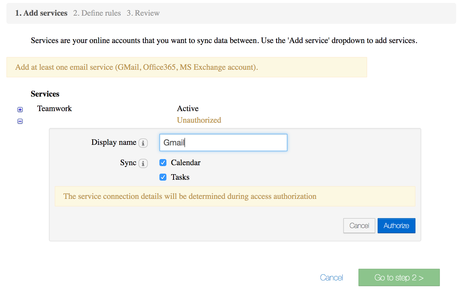 2\. Specify how you would like to name the Gmail service in your Yoxel app instance and select you would like to sync Calendar and/or Tasks