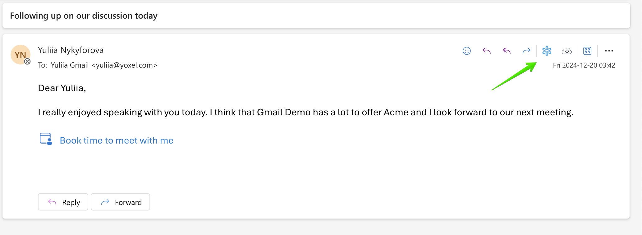 Once Yoxel Salesforce Add-on is installed you should be able to open it in the task pane for any selected email by clicking the add-on's icon: