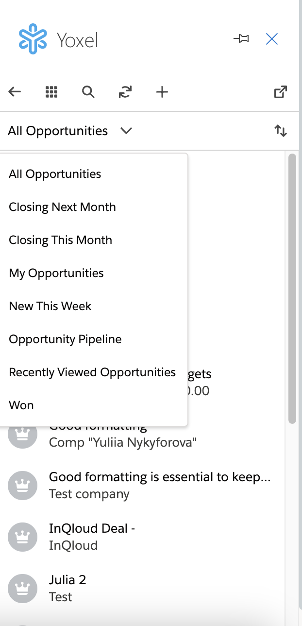 Yoxel Mailbox Assistant allows you to use your Salesforce views. Simply select one of the list tabs (Events & tasks, Opportunities, Leads, Accounts, Contacts, Cases)